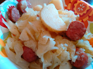 You will need a very large stock pot for this recipe. Cut the cabbage into small pieces. Slice the smoked sausage into thin rounds. It is not necessary to peel the potatoes. Just quarter them. Add all of the ingredients to the pot, including onion and spices. Cover ingredients with just enough water to be at the top.